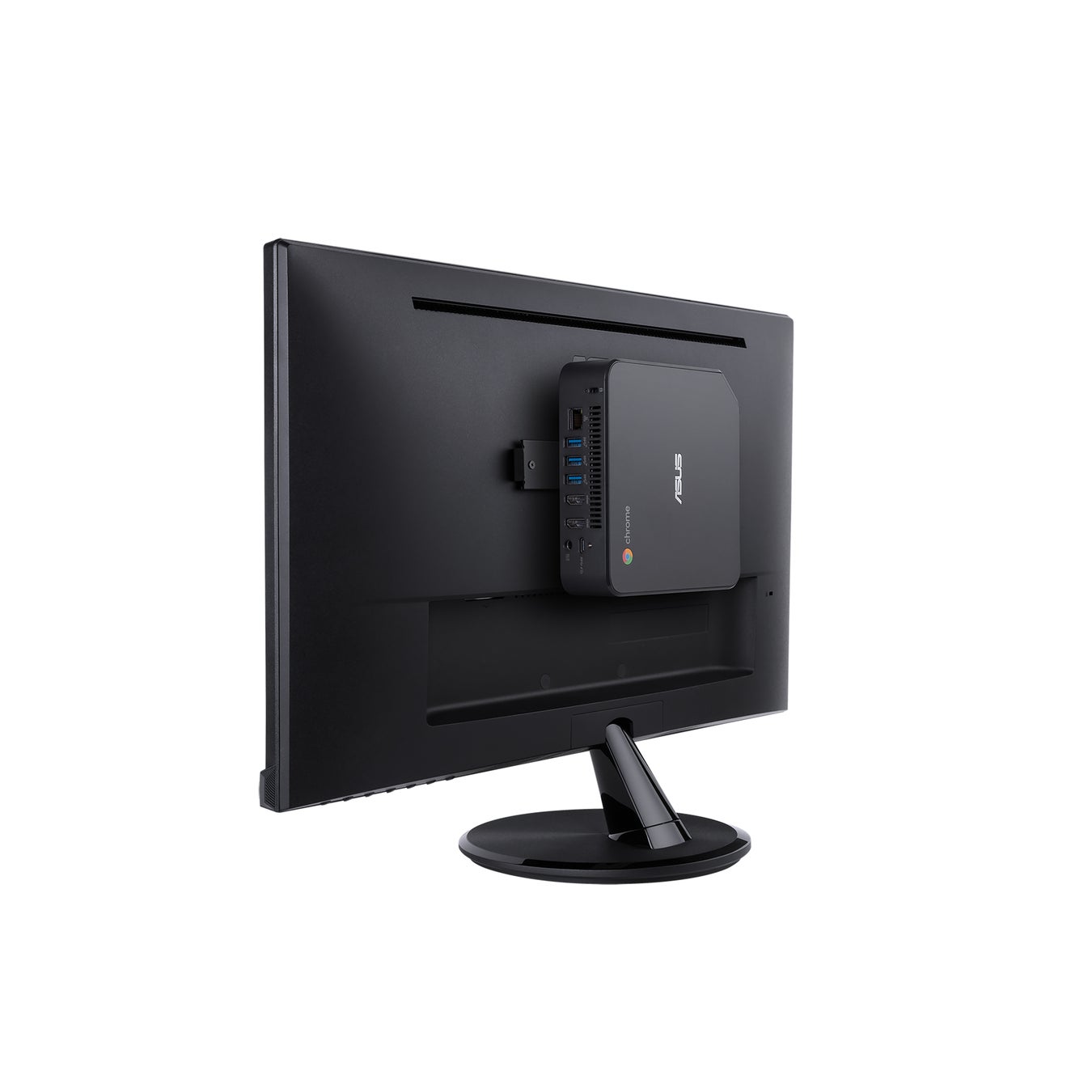 ASUS Chromebox 4の本体は、148.5 x 148.5 x 40 mmのコンパクトサイズで設置場所を選びません。ロック機能付きの新しいVESAマウントで、幅広い表面にしっかりと固定することができます。また、VESAマウントに付属しているねじ込み式のゴム製保護カバーは、日常的な傷や衝撃からChromebox 4を保護します。VESAマウントを使ってデバイスをディスプレイに取り付けることで、自分好みのオールインワンPCにすることもでき、すっきりと片付いたワークスペースを実現します。