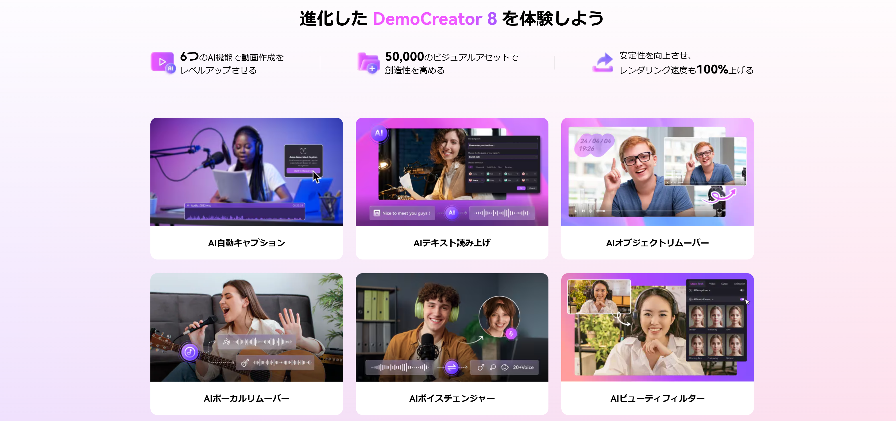 DemoCreator8では、ユーザーエクスペリエンスと高度なAIテクノロジーを導入し動画制作をサポートします。