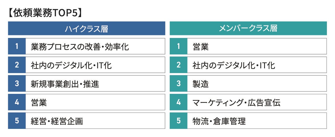 ・「新規事業創出・推進」「経営・経営企画」など、企業運営の根幹を担う業務を依頼する企業も多い。