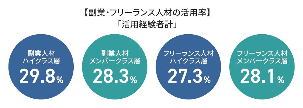 調査の結果、副業・フリーランス人材を活用したことがある企業は3割未満と、限定的であることがわかりました。一方で、活用中の企業のうち約8割が「満足」と回答しており、一定の成果を上げていることも事実です。特に、「業務プロセスの改善・効率化」(23.5ポイント)や「新規事業創出・推進」(22.1ポイント)、「経営・経営企画」(21.3ポイント)などの企業運営の根幹を担う業務において、ハイクラス層の副業・フリーランス人材の活用が多く見られました。