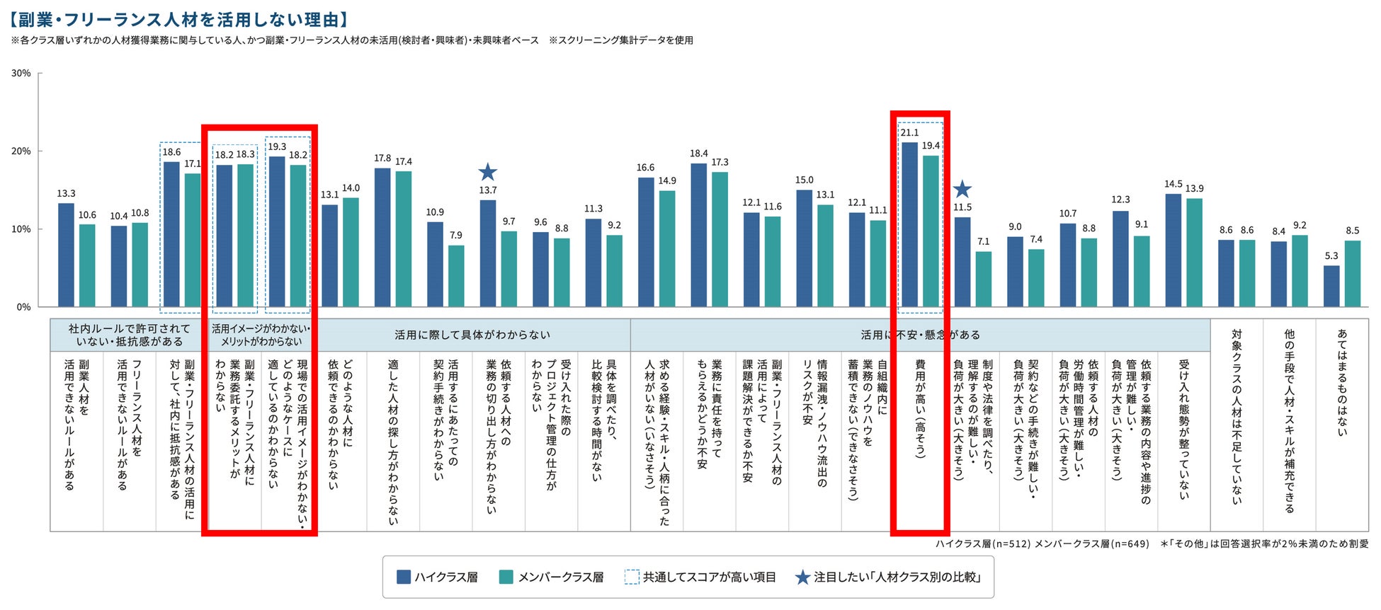 一方で、副業・フリーランス人材を「活用していない」と回答した企業の多くが、その理由として「費用が高い(高そう)」「現場での活用イメージがわかない・どのようなケースに適しているのかわからない」「副業・フリーランス人材に業務委託するメリットがわからない」と回答。副業・フリーランス人材活用についての理解が不足しており、具体的な活用イメージができていないことが主な障壁となっていることがわかります。