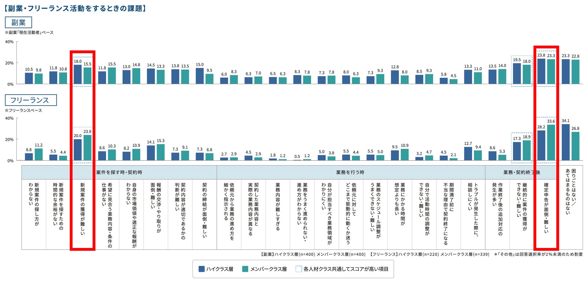 一方で、副業・フリーランスの共通課題として、「確定申告が面倒・難しい」「新規案件の獲得が難しい」など、事務的な手続きの負担感や案件獲得に関する難しさが上位に挙げられました。副業者の半数以上が、活動における何らかのサポートを必要としており、「困りごとを相談できる窓口」や「第三者による伴走サポート」などが望まれてい ます。