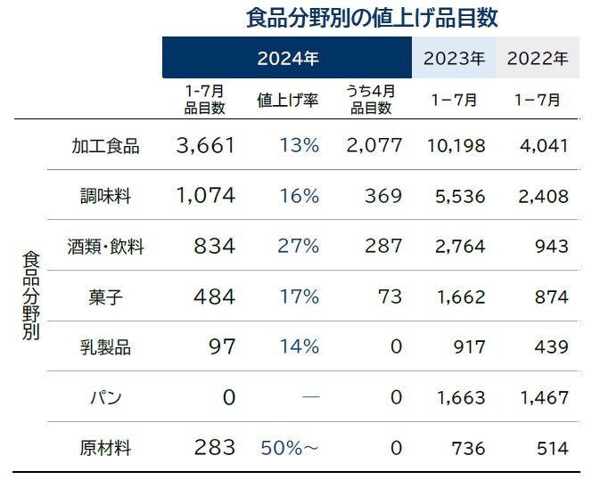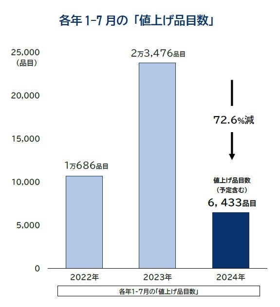 2024年の値上げ品目数は7月までの累計で6433品目となり、年間の平均値上げ率は19%に達した。23年の値上げ予定品目で6千品目到達が判明したのは22年11月時点だったのに対し、24年分では同年3月と、前年より4カ月遅いペースだった。