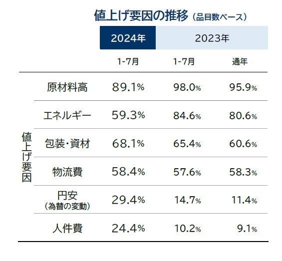 2024年の値上げでは、前年に比べて人件費や物流費の増加、円安水準の長期化などの要因が拡大した。24年(1-7月)に予定される値上げ品目のうち、「円安」(29.4%)と「人件費」(24.4%)は23年同期を大幅に上回る水準だった。なかでも「人件費」では、最低賃金の上昇以外にベースアップなど賃上げ由来の要因も出始めた点が特徴となる。