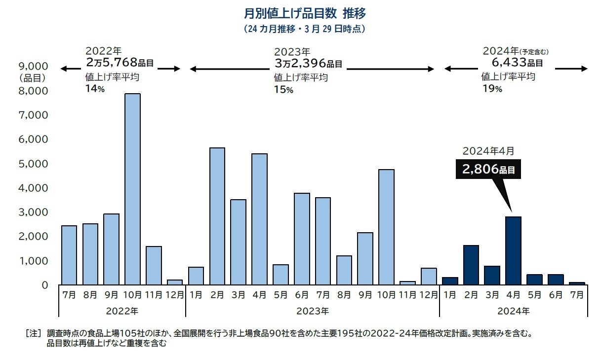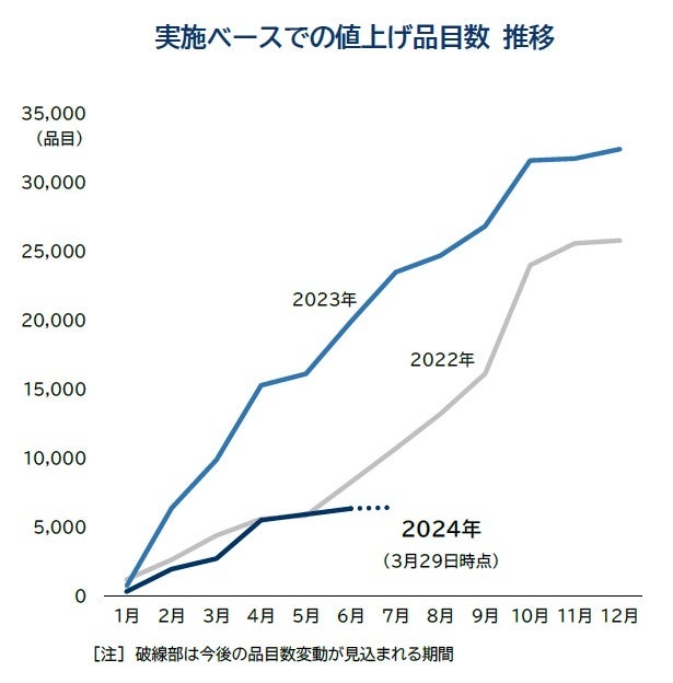 2024年の値上げは、原材料高などが押し上げる形で月平均1千品目前後、年間で最大1.5万品目前後の緩やかな値上げペースが当面続くと想定される。