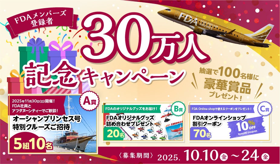 株式会社フジドリームエアラインズ(略称:FDA、本社:静岡県静岡市、代表取締役社長:本田 俊介)は、FDAメンバーズ会員登録者数30万人達成を記念し、同会員を対象に2025年10月10日(金)〜10月24日(金)の期間「FDAメンバーズ会員30万人記念キャンペーン」を実施します。