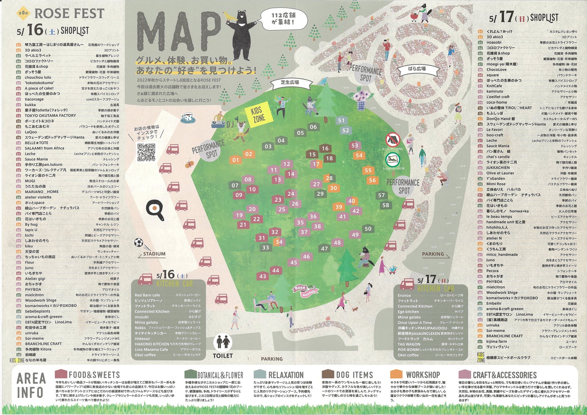 当日はバーガーやピザ、おむすび、クレープなどを販売するキッチンカーや、ばらをモチーフとした雑貨販売、ばらの香り漂うリラクゼーションルーム、ブーケづくりのワークショップなどが出店します。出店者は町田近隣で活躍するお店や作家さんです。