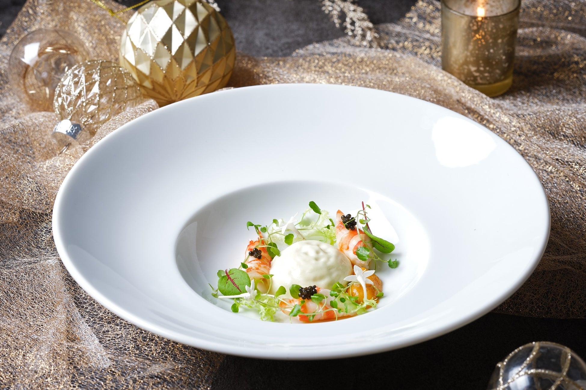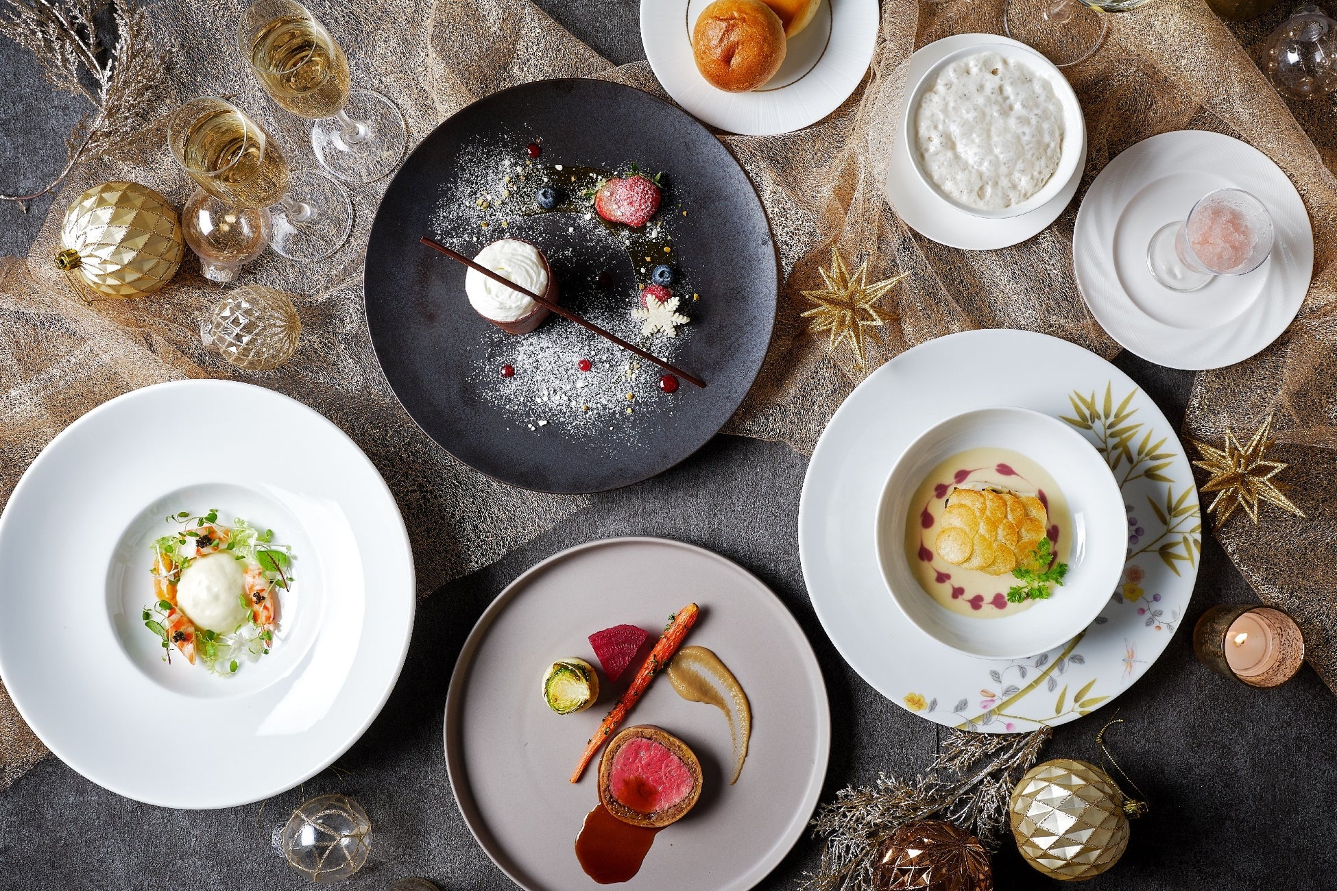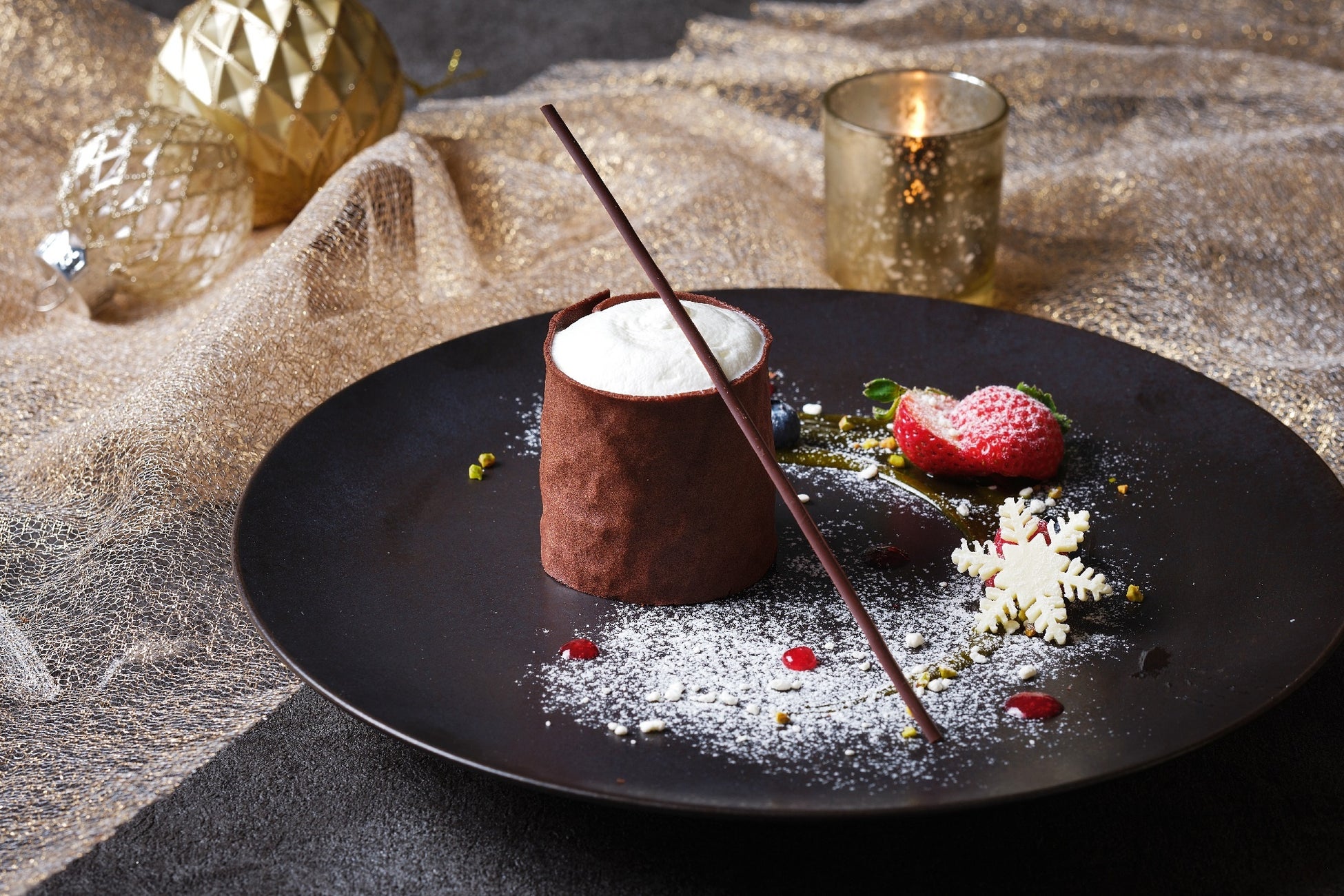 フランス料理の世界大会で受賞歴を持つ、ホテル総料理長 中宇祢満也が手掛けるスペシャルコースには、素材や風味を最大限に活かした聖夜に相応しいメニューをご用意いたしました。コースは、贅沢に雲丹とキャビアを添え貝出汁がふわっと香る車海老サラダ仕立てのオードブル、フォアグラのステーキと栗のピューレを合わせた濃厚な茸のポタージュ、シルエットが美しい平目とムール貝のフォンダンをラインナップ。メインディッシュは柔らかい国産牛フィレ肉に旨味を凝縮させた香ばしい根菜のデュクセルで包み込み、アクセントにエシャロットのピューレでお楽しみいただきます。デザートはチョコレートのムースとラズベリーのジュレにミルクエスプーマとピスタチオのソースを添え、雪が降りそそぐ情景を描いた一皿で聖なる夜を締めくくります。