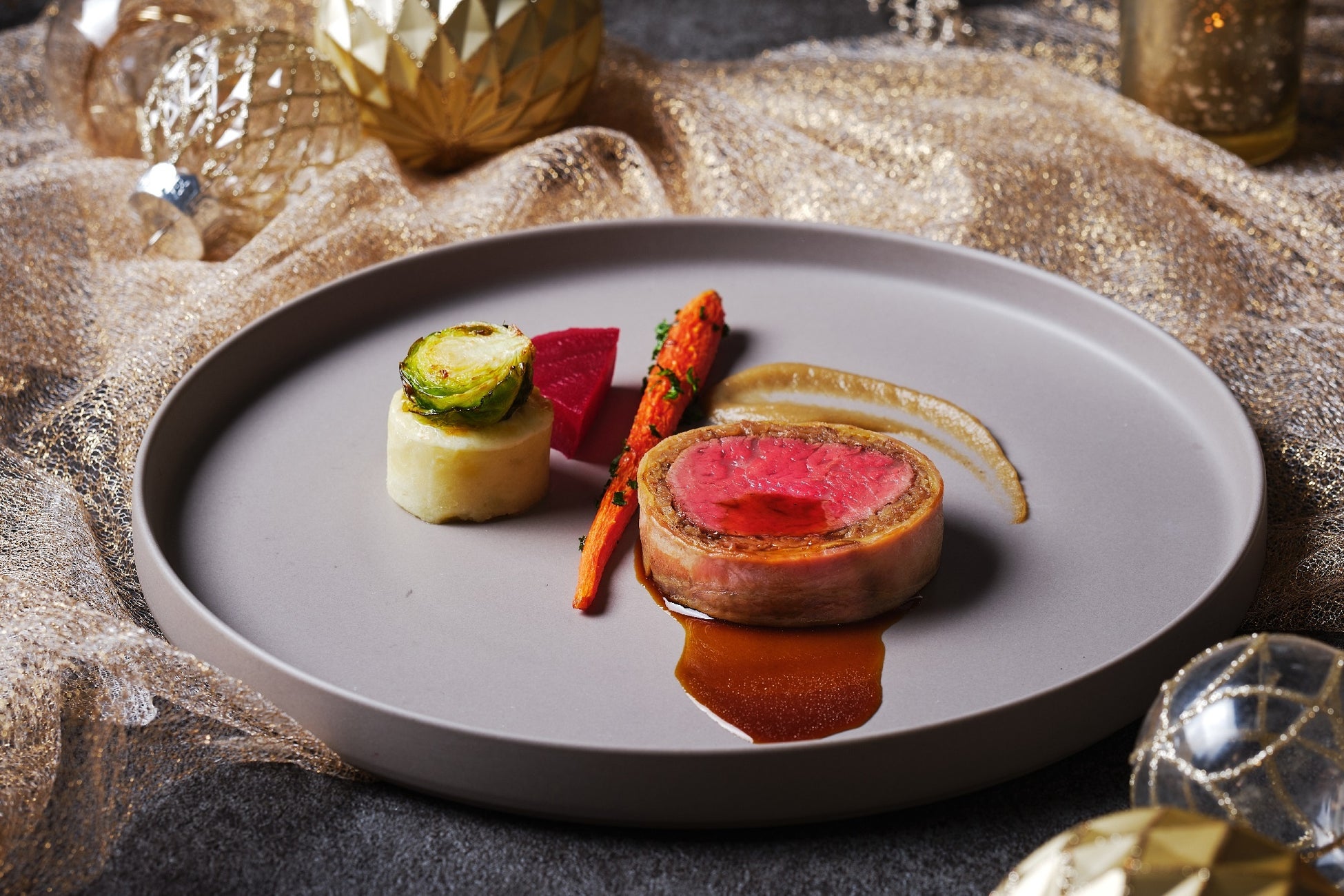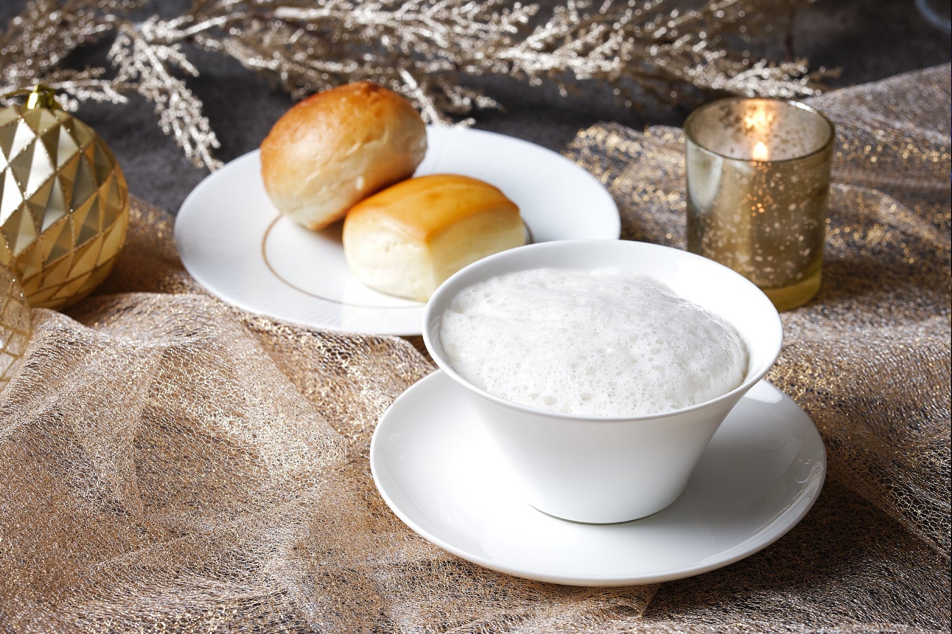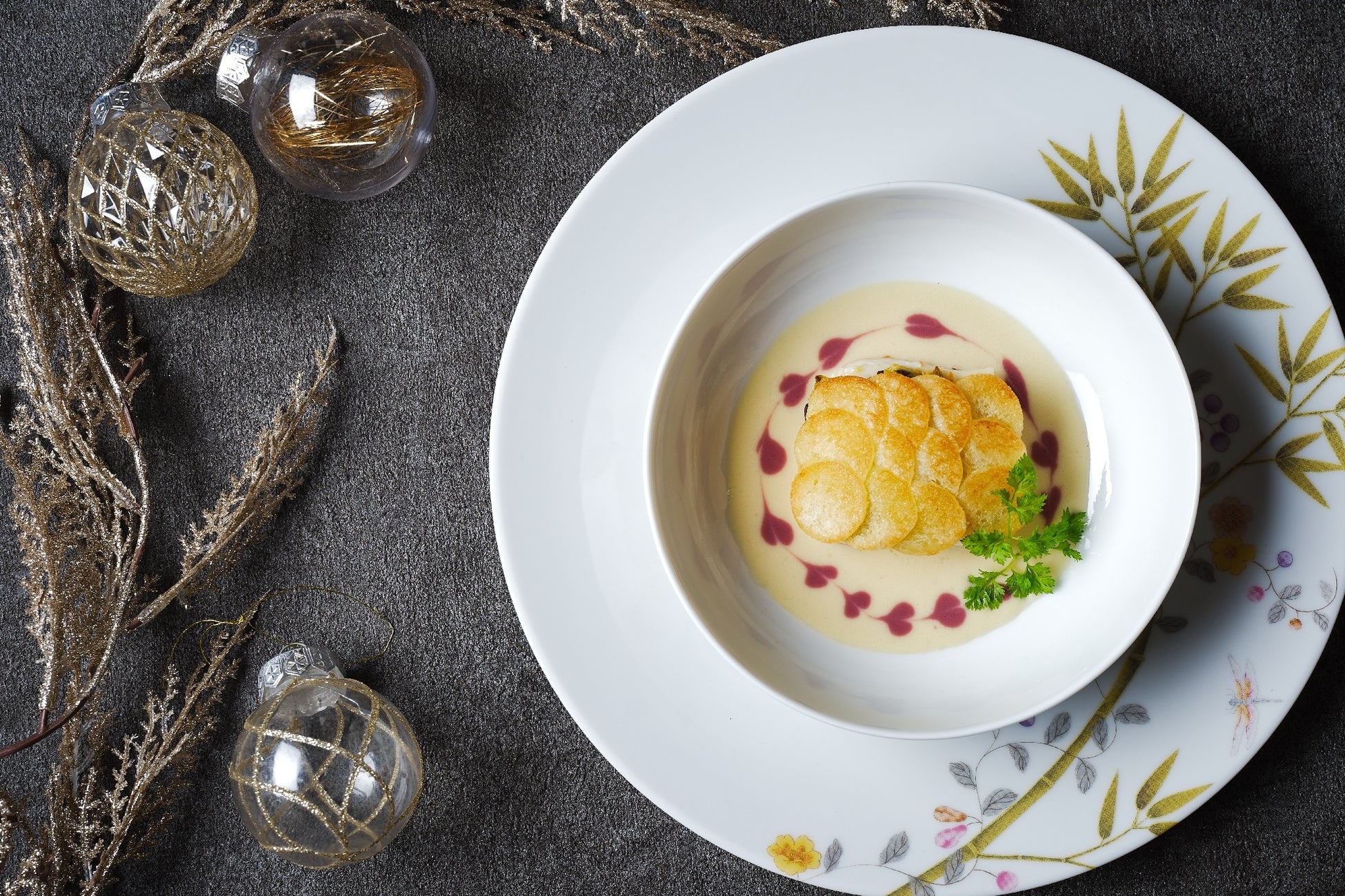 フランス料理の世界大会で受賞歴を持つ、ホテル総料理長 中宇祢満也が手掛けるスペシャルコースには、素材や風味を最大限に活かした聖夜に相応しいメニューをご用意いたしました。コースは、贅沢に雲丹とキャビアを添え貝出汁がふわっと香る車海老サラダ仕立てのオードブル、フォアグラのステーキと栗のピューレを合わせた濃厚な茸のポタージュ、シルエットが美しい平目とムール貝のフォンダンをラインナップ。メインディッシュは柔らかい国産牛フィレ肉に旨味を凝縮させた香ばしい根菜のデュクセルで包み込み、アクセントにエシャロットのピューレでお楽しみいただきます。デザートはチョコレートのムースとラズベリーのジュレにミルクエスプーマとピスタチオのソースを添え、雪が降りそそぐ情景を描いた一皿で聖なる夜を締めくくります。