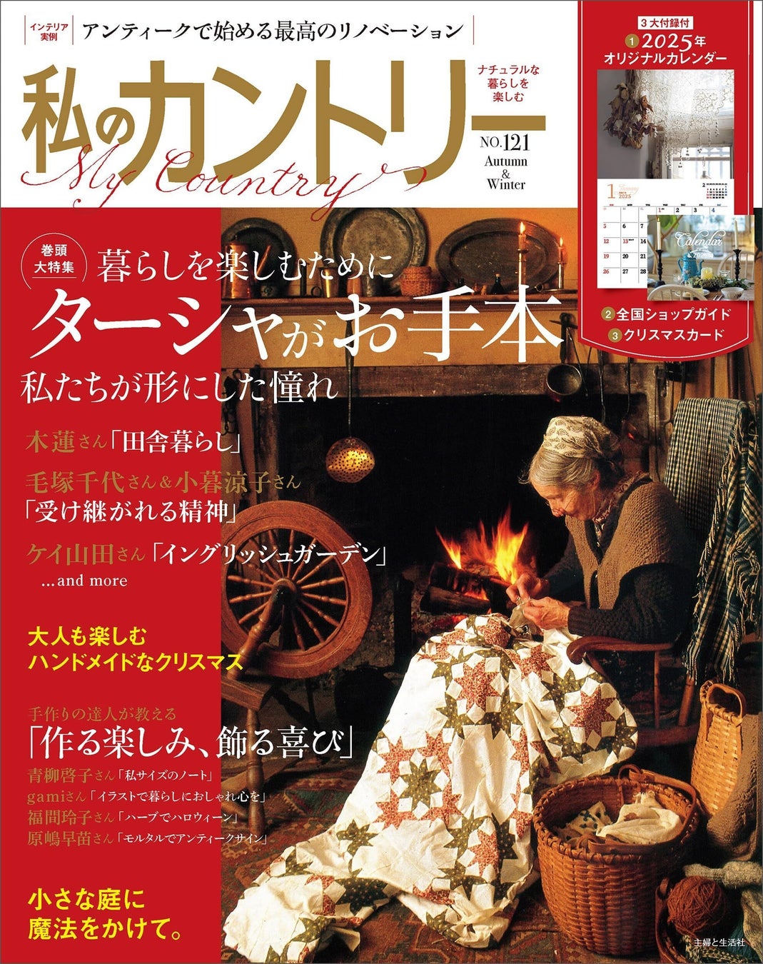 自然を愛し、古いものを慈しみ、できるだけ手作りを心がけて。そんなターシャの生き方に憧れて、彼女の言葉に励まされて前向きに、そして楽しく生きる6人をご紹介します。彼女たちが見つけたターシャのような「幸せな暮らし」とは?そのほか、「私のカントリー」ならではのクリスマスディスプレイや薪ストーブの企画にもご注目ください。