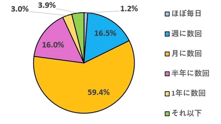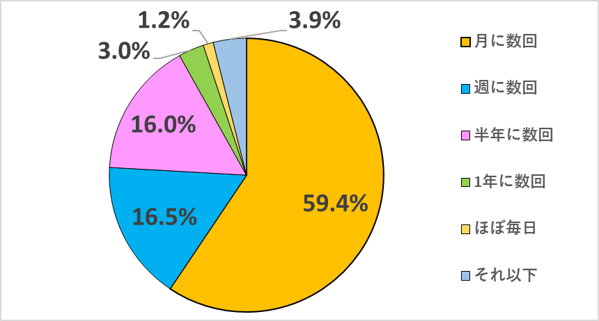 パスタを「月に数回」食べる方が59.4%と最も多く、次に多いのが「週に数回」で16.5%、続いて「半年に数回」が16.0%となっております。