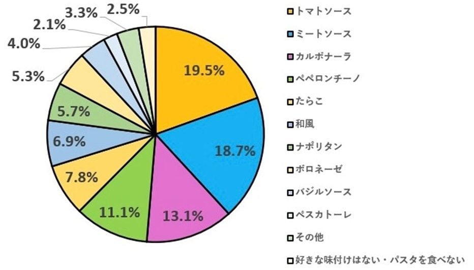 味付けに関しては意見が分かれています。最も人気だったのは「トマトソース」で19.5%。続いて「ミートソース」で18.7%とトマトベースの味付けが続いています。次に「カルボナーラ」で13.1%となりました。