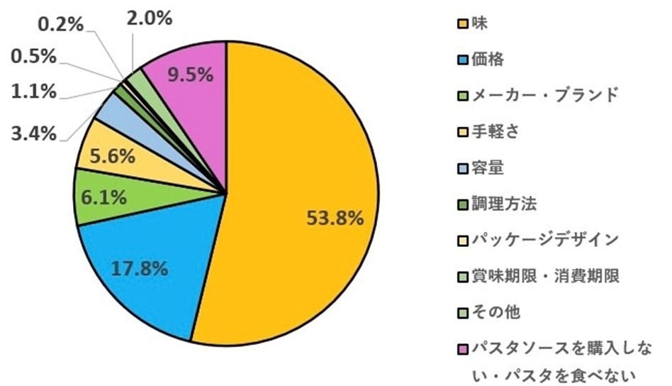 パスタソースを選ぶ際に大事にしていることは「味」がダントツのトップで53.8%、続いて「価格」が17.8%、「手軽さ」が3.4%と続きます。
