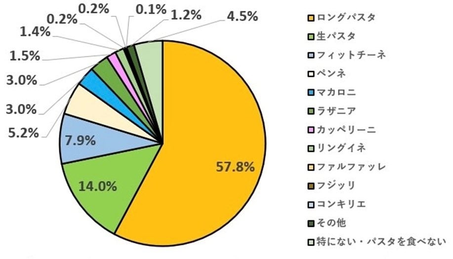 圧倒的に人気なのは定番の「ロングパスタ」で57.8%です。次に人気なのがモチモチした食感が楽しい「生パスタ」で17.8%となっています。あまり聞きなれない「フィットチーネ」が7.9%となっております。