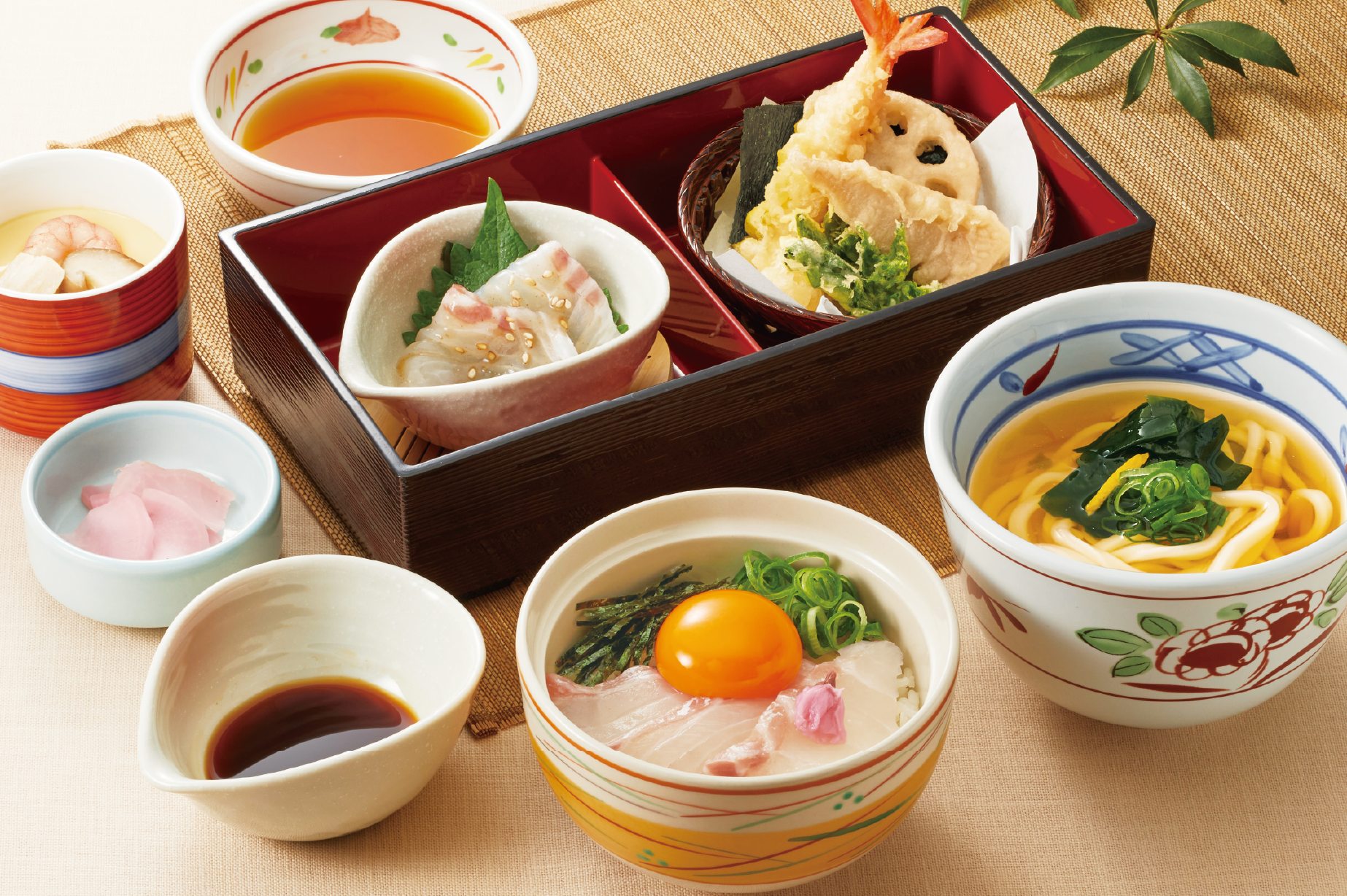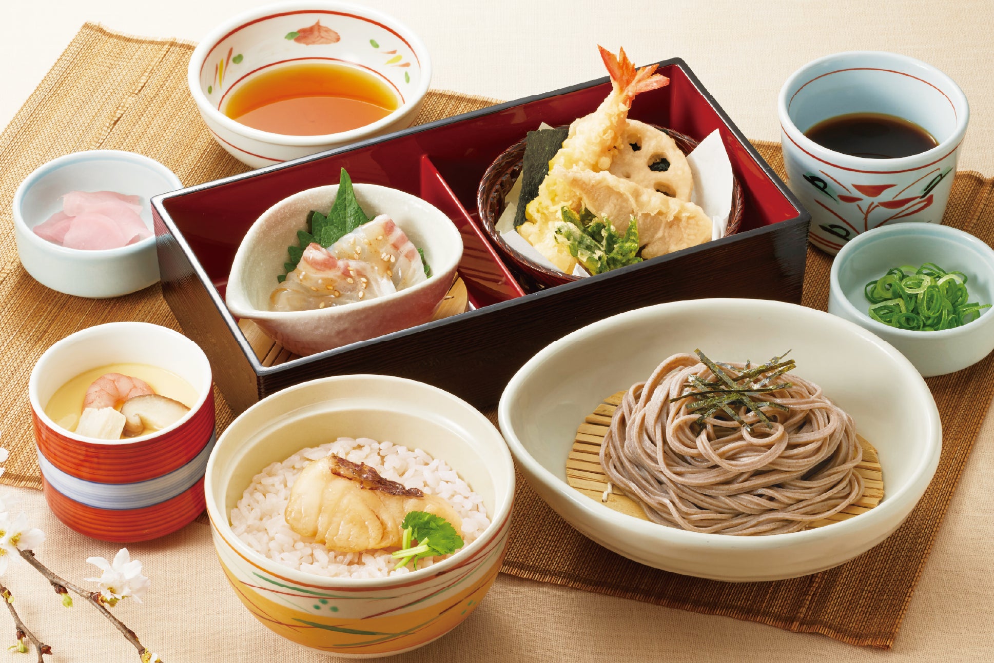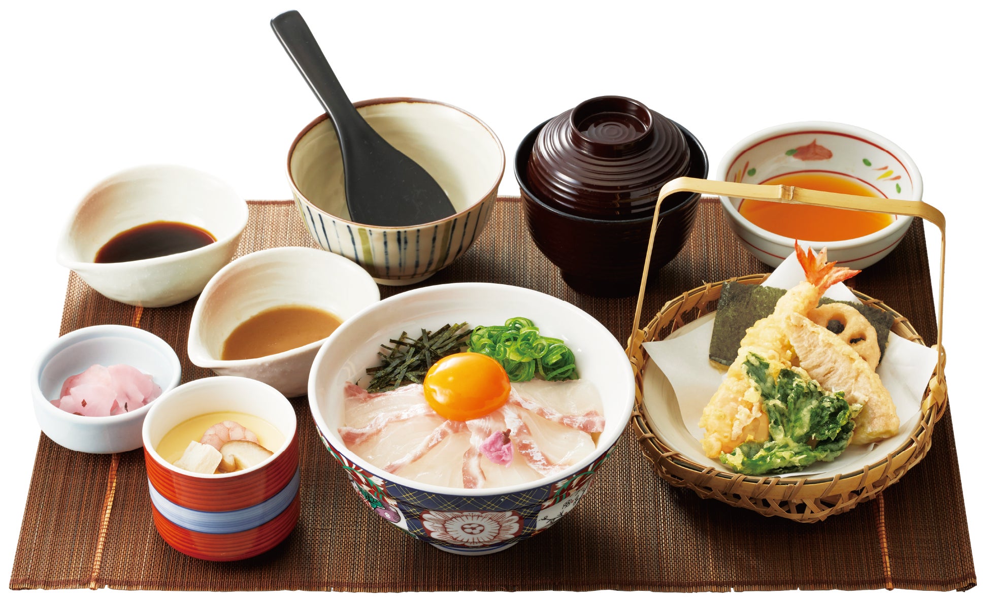 ミニサイズの鯛めしと、「春の天ぷら盛り合わせ」「真鯛の胡麻だれ小鉢」「選べるミニ麺」など色んなお料理を一つの御膳で楽しめる一品。鯛めしは「宇和島風」と「松山風」の2種類の中からお好きな鯛めしをお選びいただけます。