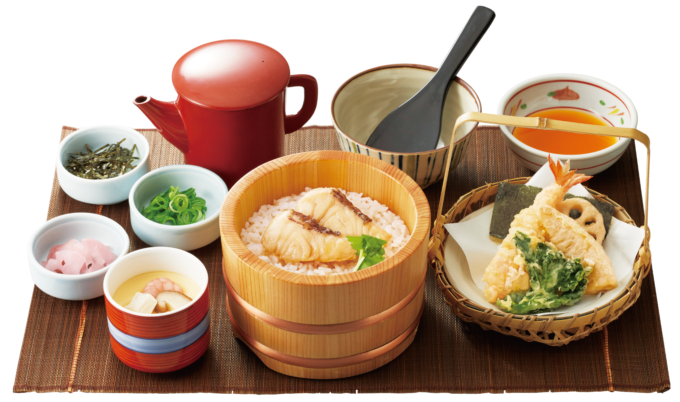 香ばしく焼き上げた鯛と、鯛の旨味を引き出した特製だしをごはんと合わせた一品。しゃもじで鯛をほぐしながら、ごはんと混ぜ合わせてお召し上がりください。薬味とおだしをかけて「鯛茶漬け」としても楽しめます。