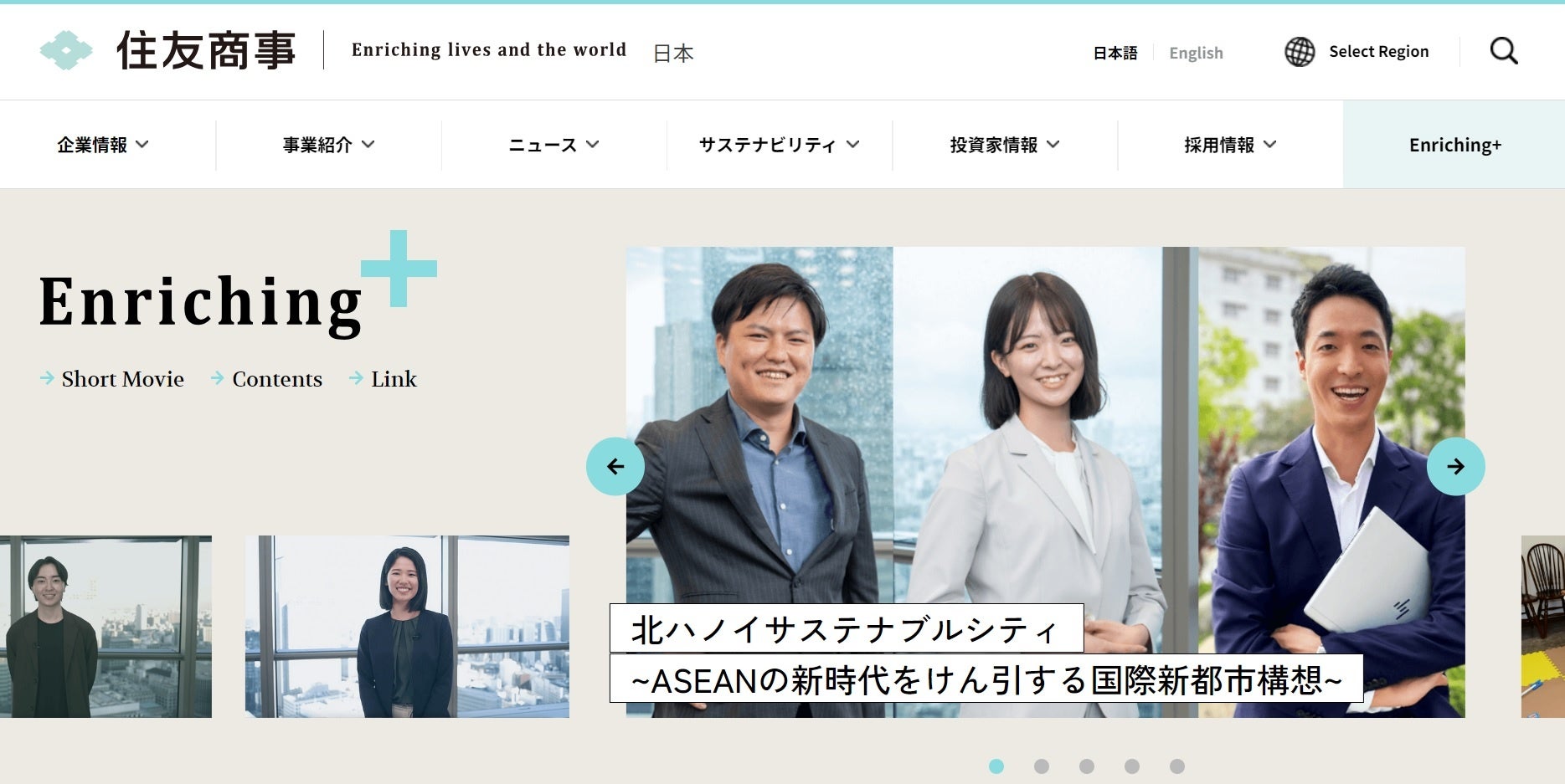 「Enriching+」は、住友商事グループが展開する幅広い事業や取り組み、世界中で活躍する社員など、当社のリアルな姿を多様なコンテンツを通じて紹介します。事業案件の紹介だけでは伝え切れなかった社員の想い、事業の裏側にあるストーリーなど、さまざまな切り口でお伝えします。
