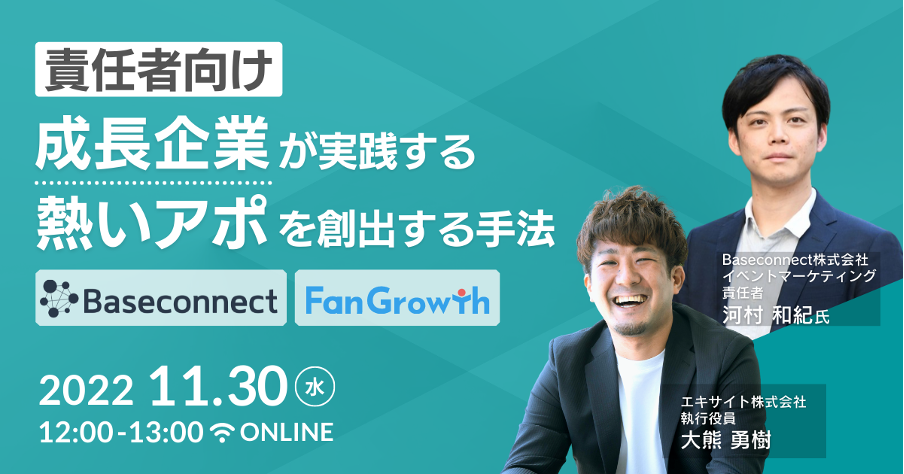 エキサイト株式会社(所在地:東京都港区、代表取締役社長:西條晋一)は、Baseconnect株式会社(所在地:京都府京都市中京区、代表取締役社⻑:國重侑輝)のイベントマーケティング 責任者 河村和紀氏を迎え、2022年11月30日(水)12:00より「成長企業が実践する熱いアポを創出する手法」をテーマに参加費無料のウェビナーを開催します。