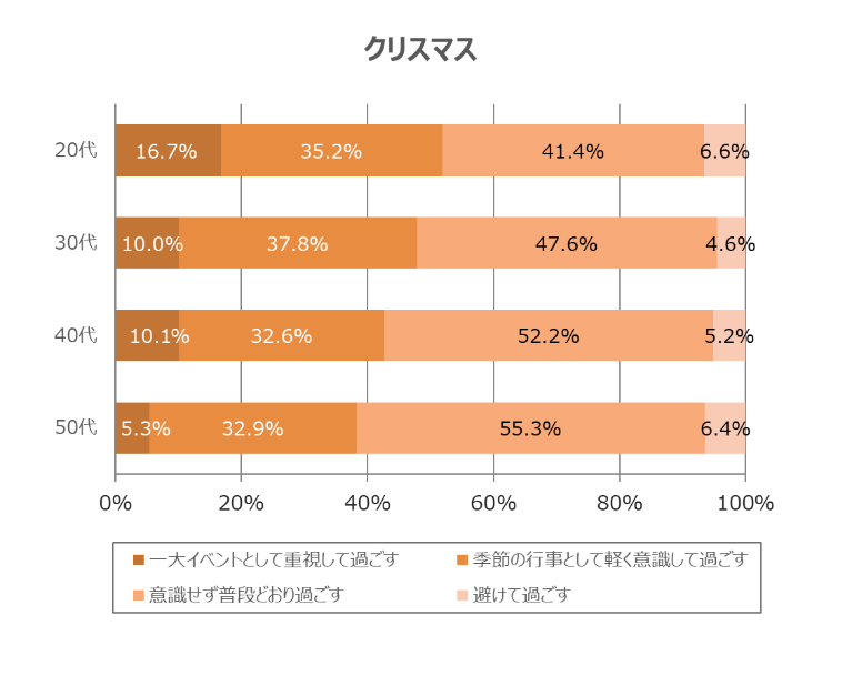 果たして、20代には「イベントキャンセル界隈」の兆候があるのか、それとも逆に、20代には季節イベントを楽しむ人が多いのか。この調査結果を、年代別に集計してみました。