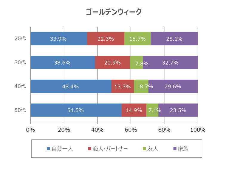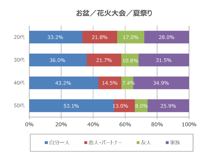 こちらの結果も年代別に集計してみました。20代の傾向として、「正月(初詣含む)/大晦日」を除き、「自分一人」で過ごしたいと回答した割合が年代別に見て最も少なくなっていました。