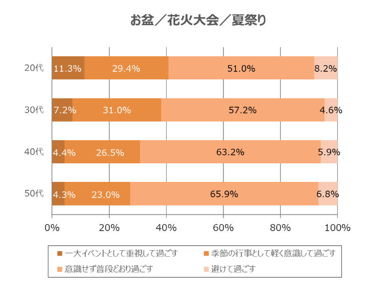 逆に「避けて過ごす」を選んだ人が多かったのは、「ハロウィン」(8.9%)、「お花見」(7.2%)、「ゴールデンウィーク」「お盆/花火大会/夏祭り」(同率6.9%)でした。