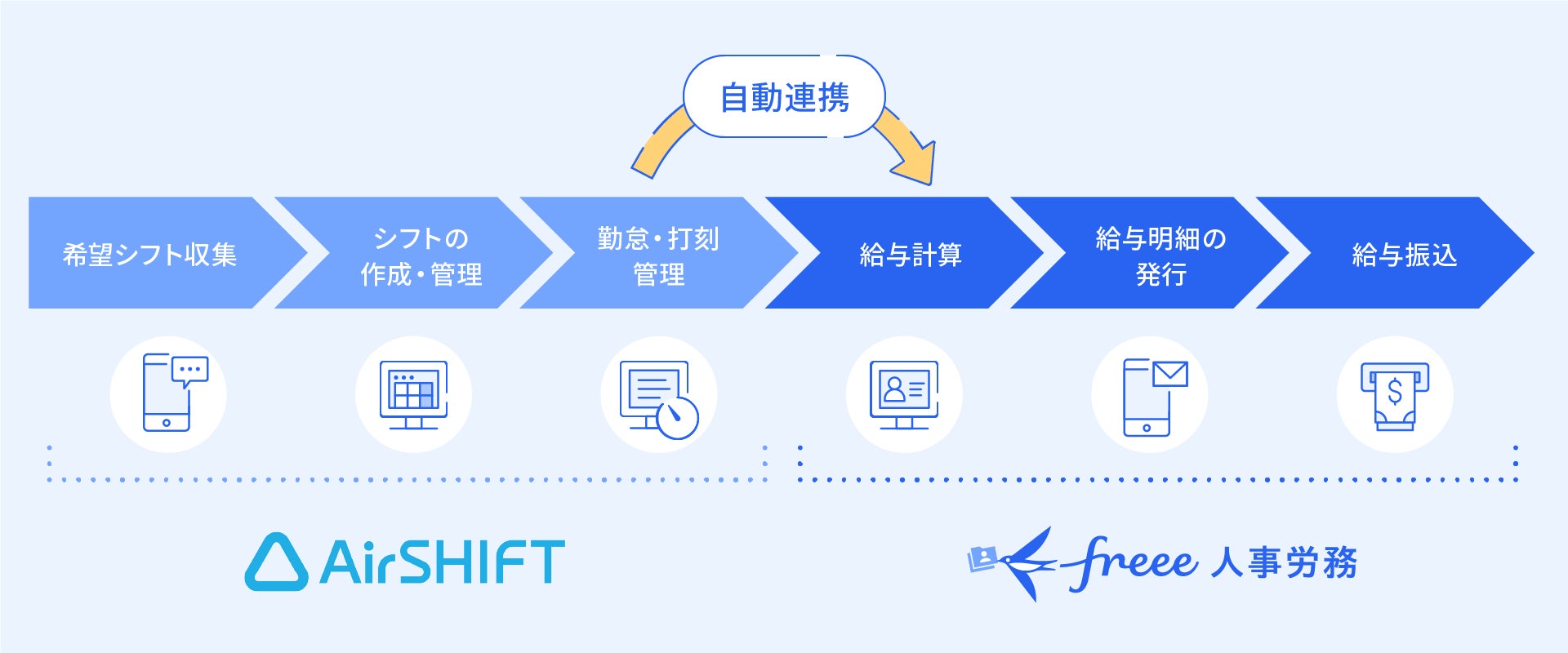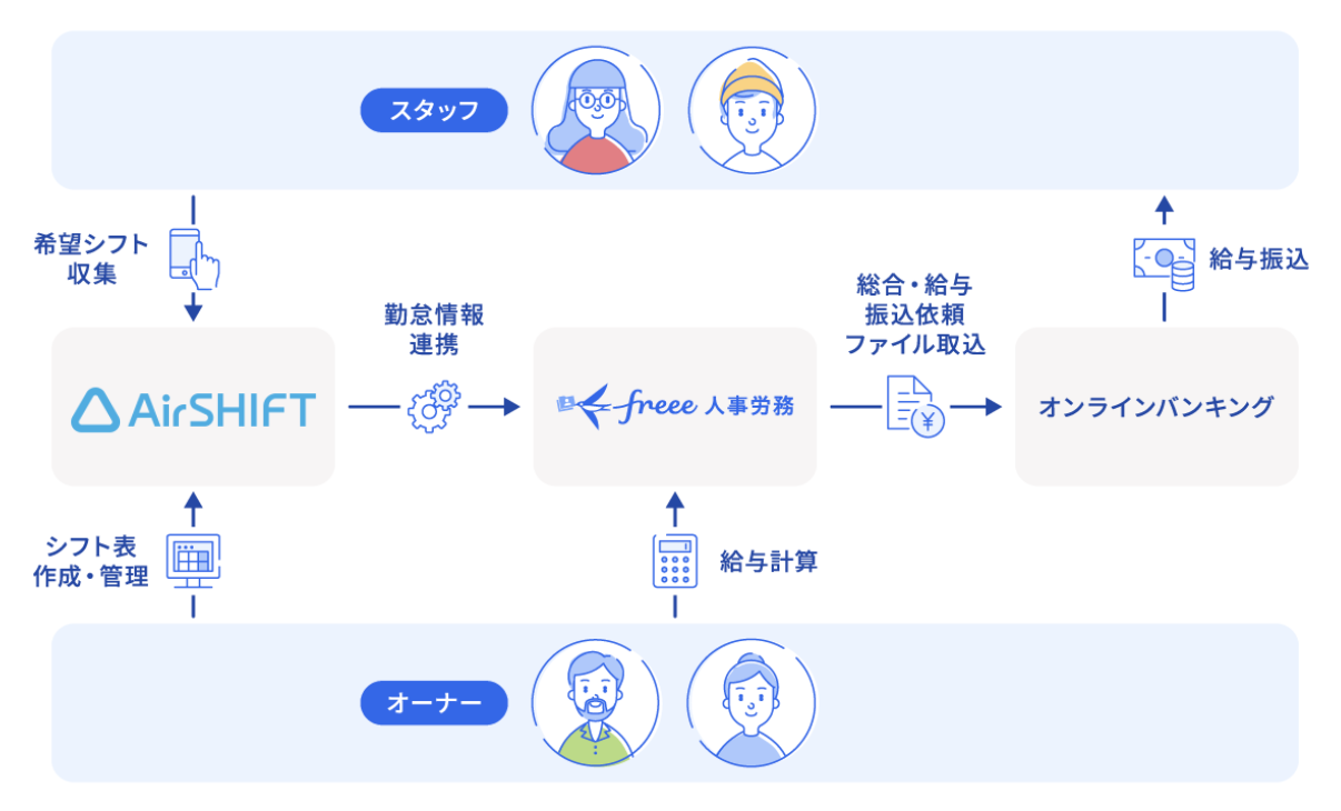 『Airシフト』で管理した勤怠情報をfreee人事労務に連携することによって、シフト調整から給与計算・振込までの一連の業務を手作業なく効率的に運用することができるようになります。