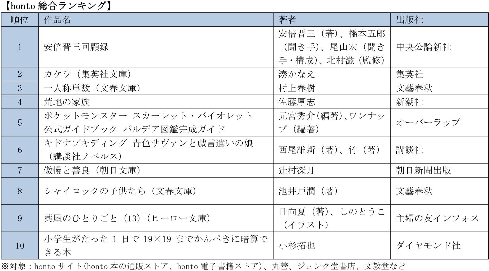 ~20代・30代1位は西尾維新さんの『キドナプキディング 青色サヴァンと戯言遣いの娘』、40代1位は『安倍晋三回顧録』~ -honto2月月間ランキング発表!-