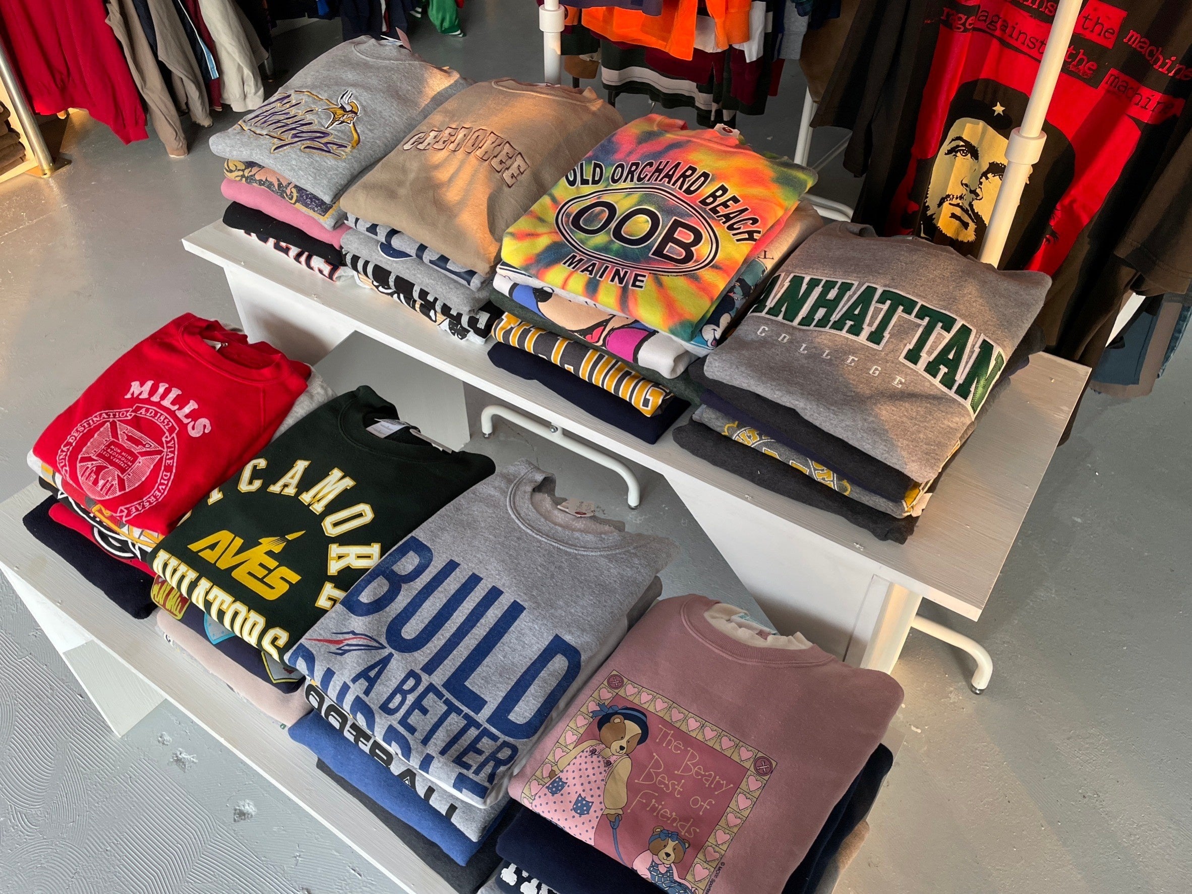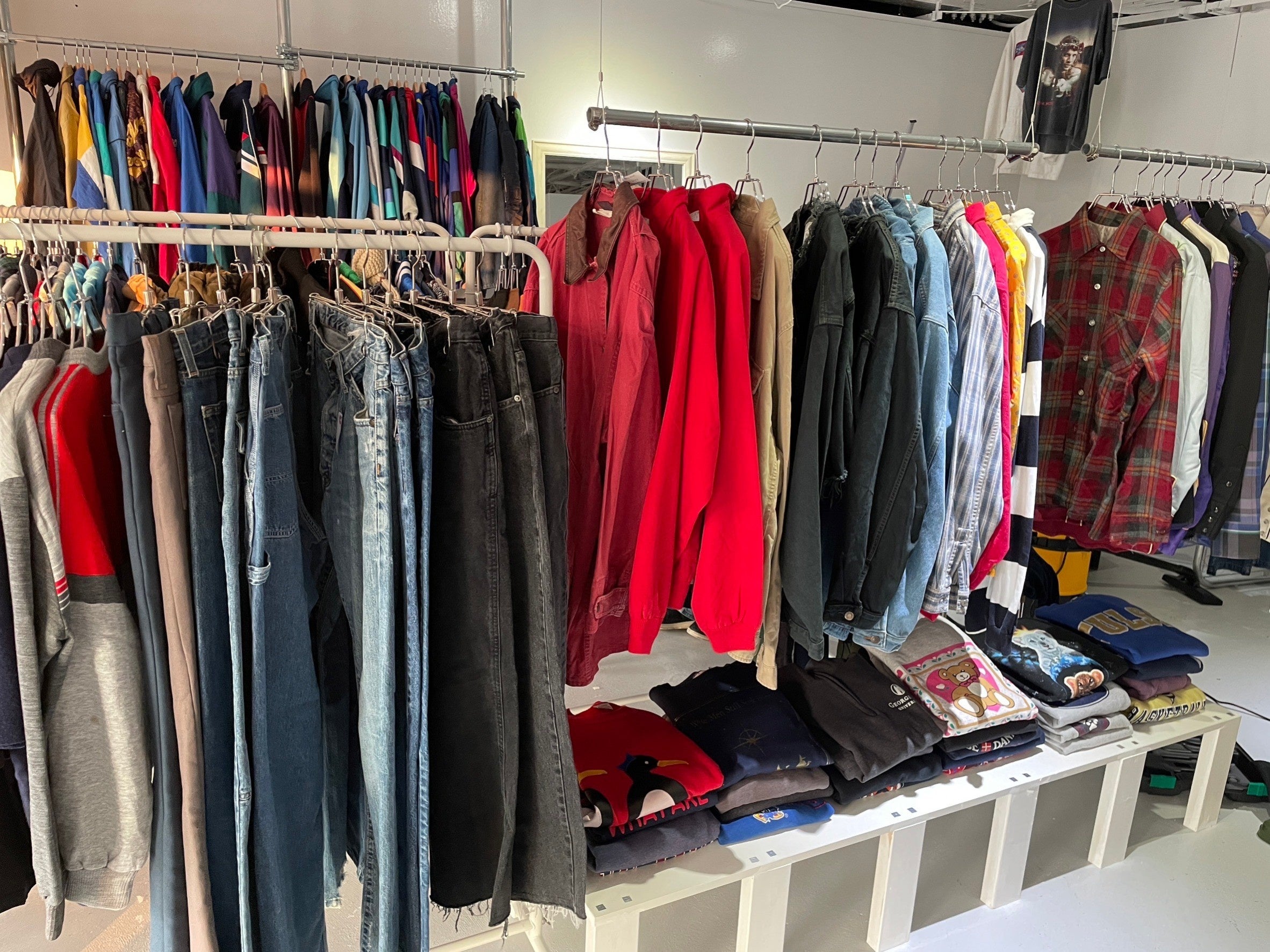 全国に展開するアパレルショップSPINNSの古着アイテムをオーナー朝長がピックし、売場にて編集・提案するSMILEの店内。