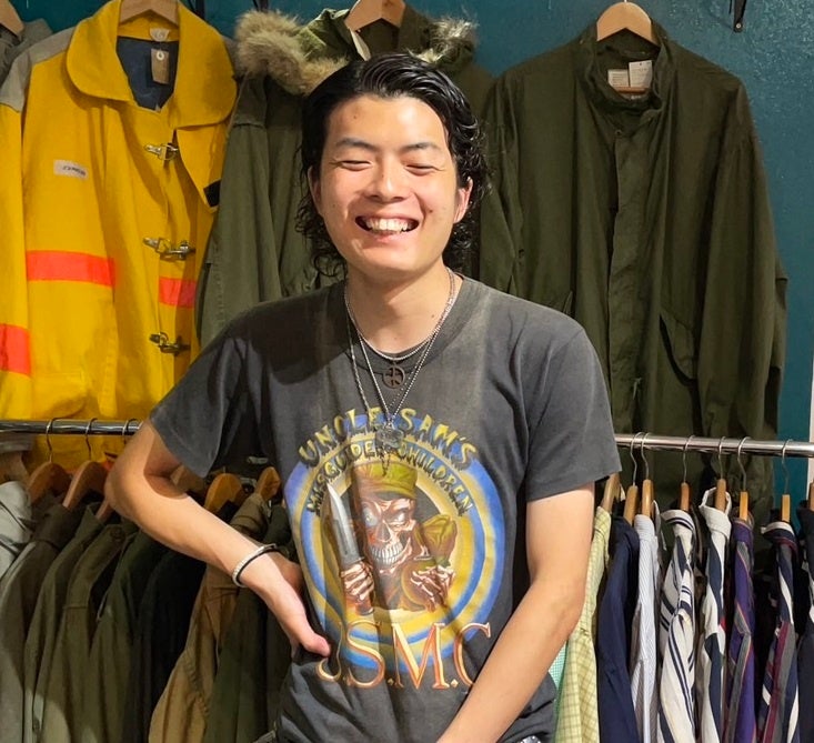 オーナーの朝長は古着屋経営の夢をもち、2021年より武雄市にオープンしたSPINNSにてスタッフ修行。