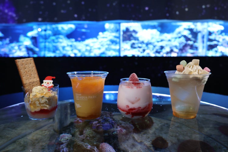 約3分間に一度、満天の星空につつまれるショータイムもあり、お好みのドリンクを片手にくつろぎの時間をお過ごしいただけます。館内でお持ち歩き可能なイベントメニューは、クリスマスにぴったりなスイーツや、赤×白でクリスマス感あふれるドリンクなど4種類をご用意しました。ご購入いただいた商品は館内でのお持ち歩きが可能なため、 ご見学のお供にオススメです。