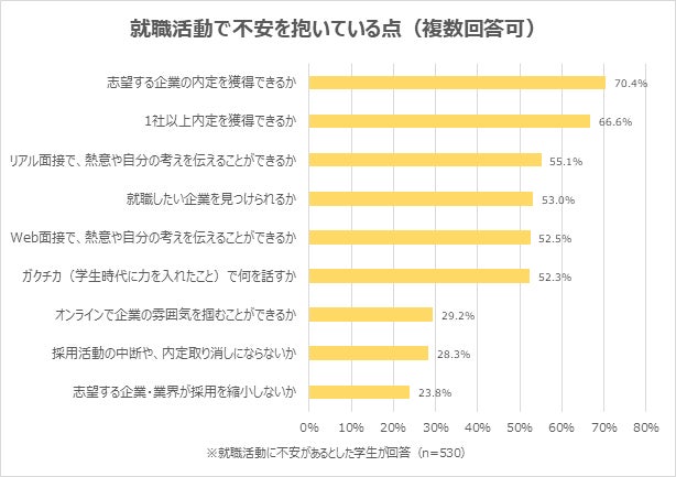 就職活動で不安を抱いている点は、「志望する企業の内定を獲得できるか」が70.4%で最多。次いで、「1社以上内定を獲得できるか」66.6%、「リアル面接で、熱意や自分の考えを伝えることができるか」55.1%と続きました。その他、「ガクチカ(学生時代に力を入れたこと)で何を話すか」も、半数を超える52.3%が回答しています。「内定獲得」に関する項目の他には、「リアル面接」や「ガクチカ」に関する項目が回答を集めていることから、コロナ禍で、リアル(対面)で人と話す機会が減っていることや、サークルやボランティアなど課外活動の機会を得にくいことも、就職活動の不安材料となっていると考えられます。