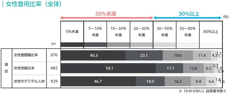女性管理職比率について、「30%未満」の合計は93.4%。うち、40.3%が 「5%未満」であった。女性役員比率では「30%未満」の合計は95.0%にのぼり、 うち、 59.1% が「5%未満」と半数以上を占める。女性のデジタル人材(AIやクラウドなど最新のデジタル技術を活用して業務を推進する人材)については、管理職比率・役員比率よりも女性の割合が高いものの、9割以上の企業が「30%未満」であった。