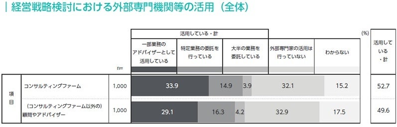 経営戦略の検討における外部専門機関の活用について、「コンサルティングファーム」を活用している企業は52.7%、「(コンサルティングファーム以外の)顧問やアドバイザー」を活用している企業は49.6%であった。いずれかの外部専門機関を活用している企業は、全体の58.9%となった。