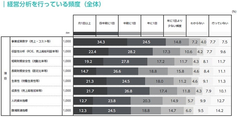 経営分析を行っている頻度として、売上・コストなどの「事業成果数字」は、月1回以上行っている企業が34.3%で、高頻度で行われる傾向にある。「収益性分析」や「生産性」「成長性」についても、「月1回以上」と回答した企業が20%を超えた。