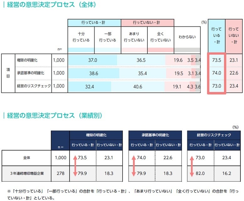 経営の意思決定プロセスについて、「権限の明確化」「承認基準の明確化」「経営のリスクチェック」の状況について尋ねた。いずれの項目についても、「十分行っている」「一部行っている」の合計が70%強であった。業績別に見ると、3年連続増収増益企業はいずれの項目とも「行っている・計」の割合が全体平均より高かった。