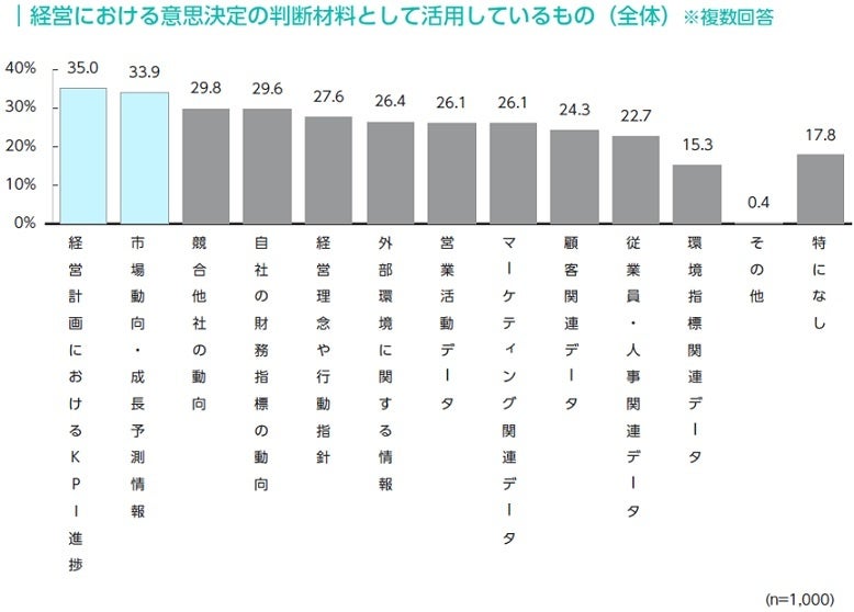 経営における意思決定の判断材料としては、「経営計画におけるKPI進捗」が35.0%、「市場動向・成長予測情報」が33.9%で上位に挙がった。また、環境指標以外の全データで20%を超えるなど、経営の判断材料としてさまざまな指標が活用されていることがわかった。