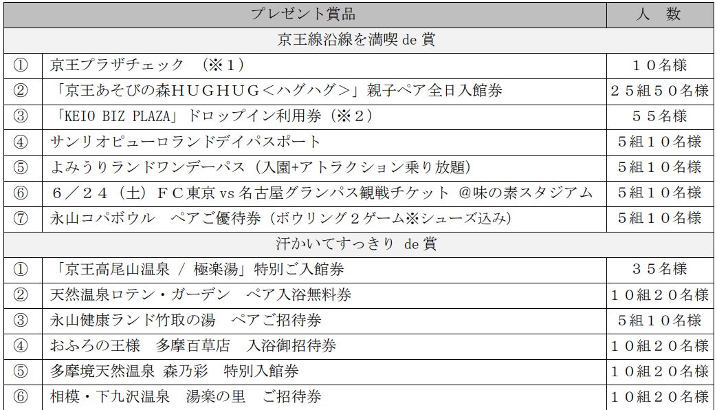 また、4月21日(金)~5月7日(日)にアウトレットで三井ショッピングパークカード《セゾン》を使って5,000円(税込み・合算可)以上のお買い物をした方を対象に、抽選で京王プラザホテルの宿泊や飲食の際に使用できるチケット「京王プラザチェック」など京王沿線施設の各種優待チケットをプレゼントする「アウトレットde“楽しい夏”プレゼントキャンペーン」も実施します。