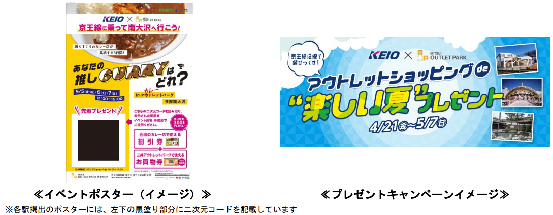 本企画は、「京王線・井の頭線各駅に掲出するポスターに記載の二次元コードを読み込んで表示された画面」または「京王アプリ配信投稿に記載のURLからアクセスし表示された画面」をイベント会場内事務局で提示すると、カレーフェスで利用できる100円割引券と、アウトレットで利用できる500円お買物券(5,000円(税込み)のお買上げごとに1枚利用可)をプレゼントする「割引券・お買物券プレゼントキャンペーン」を実施するものです。これにより首都圏を中心とした人気カレー店8店舗(予定)が集まるカレーフェスや、アウトレットでのお買物・お食事もおトクにお楽しみいただけます。