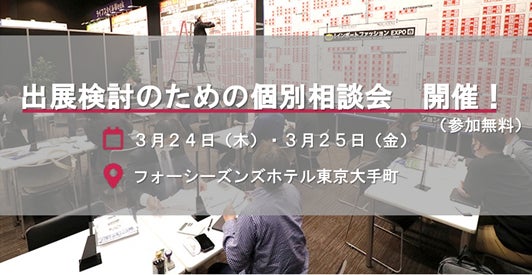 事務局では多数の出展検討のお問い合わせを一挙にお答えするため、3/24(木)・25(金)にフォーシーズンズホテル東京大手町にて「出展検討のための個別相談会」を実施いたします。