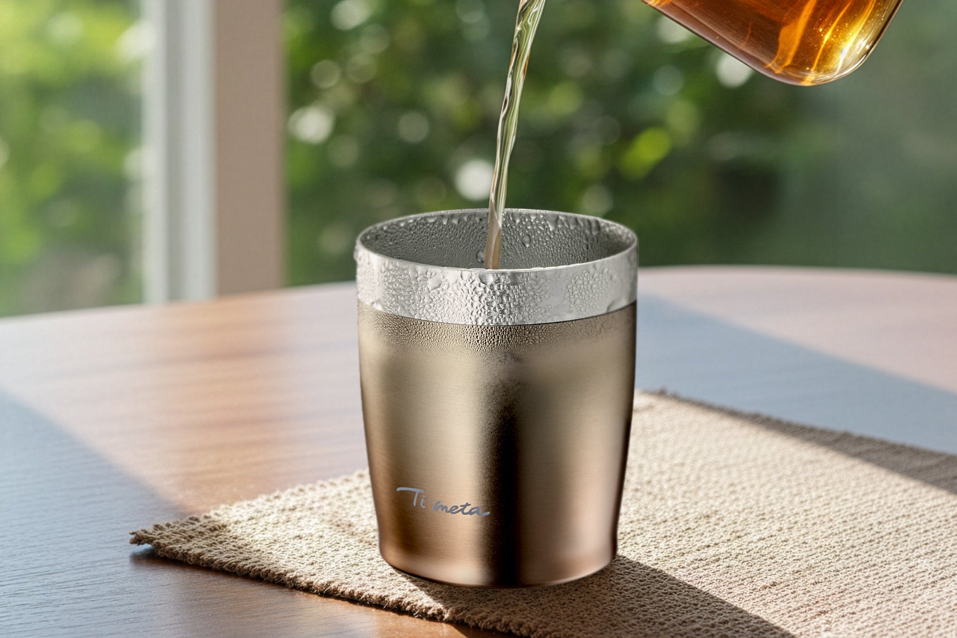 アルミの熱伝導率はステンレスの約15倍で、タンブラー内に入れた飲みものの温度を素早く伝えます。そのため、冷たい飲みものを注ぐと、冷たさが飲み口へすばやく広がり、唇が触れた瞬間、より冷たさを感じることができます。
