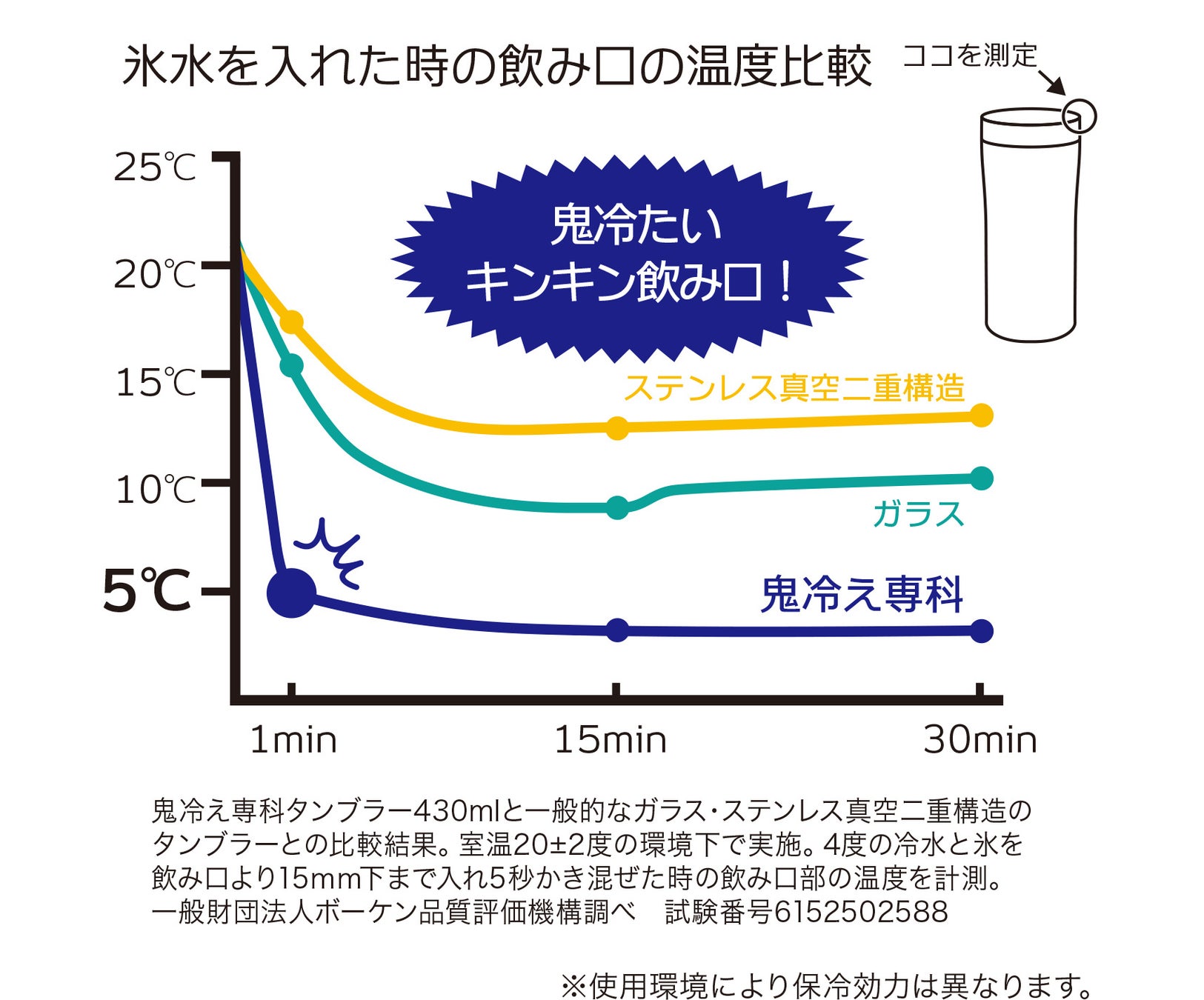 氷水を入れた際の飲み口温度を比較した検証では、一般的なステンレス真空二重構造タンブラーやガラス製グラスの場合、約1分後の飲み口温度はいずれも約18度程度にとどまり、飲み口まで十分に冷えにくいことが分かります。一方、鬼冷え専科では、冷たさが素早く伝わり、約1分後には約5度まで低下、唇にダイレクトに冷たさが伝わる“鬼冷たい”感覚をお楽しみいただけます。