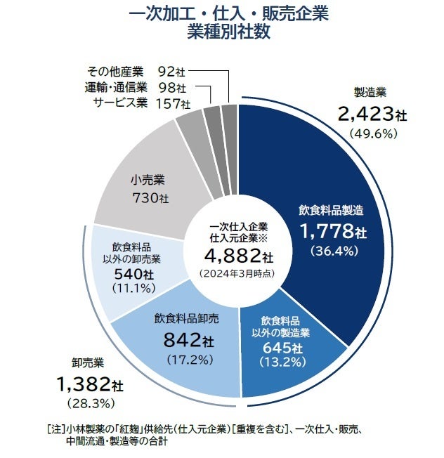 その結果、225事業者から直接商品等の仕入・販売等の取引関係を有する「一次販売企業」が873社、原料等として仕入等の取引関係を有し、流通・加工を行う「中間流通・製造等(一次仕入加工)」の企業が3878社判明した。また、一次加工企業から商品の仕入・販売等といった取引関係を有する「二次仕入・販売企業」は2万8775社判明し、直接的・間接的に紅麹製品を消費者へ販売・提供している可能性のある取引企業は2万9648社に上った。製造・販売を含めた企業の合計は3万3526社となり、小林製薬から直接紅麹原料を仕入れた225事業者(重複等含む)と合わせると、国内最大3.3万社で、小林製薬製の紅麹原料を使用した製品が流通している可能性がある。