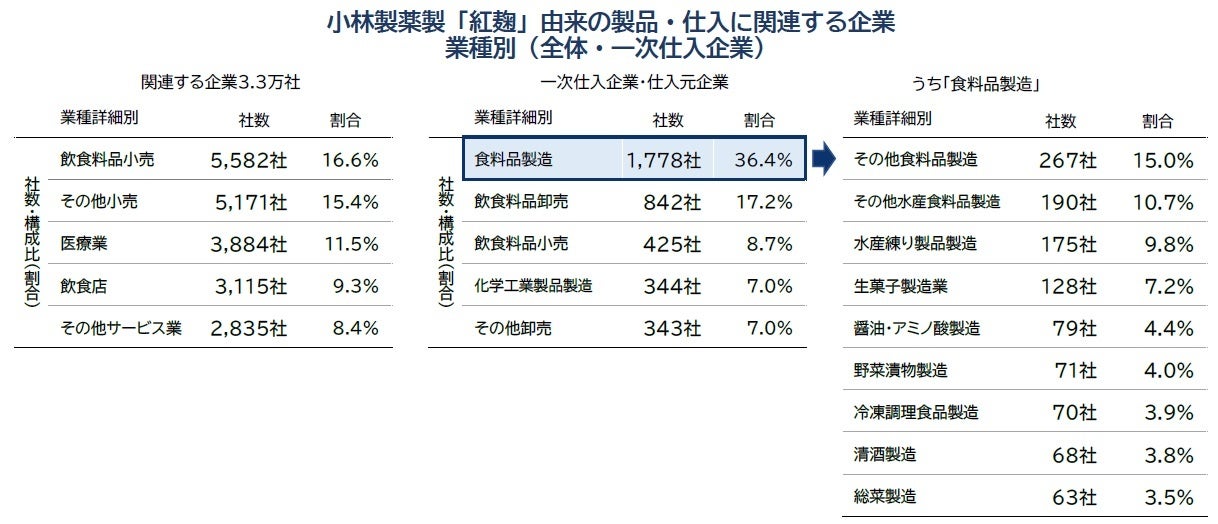 [注1] 帝国データバンクは、保有する企業データベースのうち、「小林製薬が直接紅麹原料を卸している52事業者および同企業から小林製薬の紅麹原料を入手している企業173事業者」から製品等を仕入れている企業について調査・分析を行った