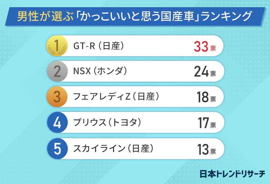 まずは、男性が選ぶ「かっこいいと思う国産車ランキング」を理由とともに発表します。