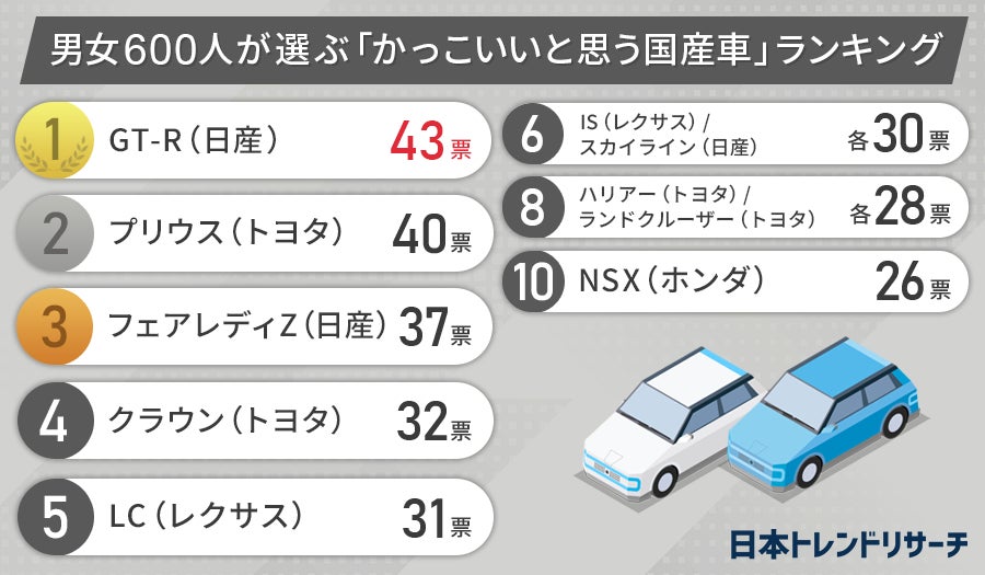 「かっこいいと思う国産車」ランキング、男性は1位が「GT-R(日産)」で女性の1位は「プリウス(トヨタ)」でした。