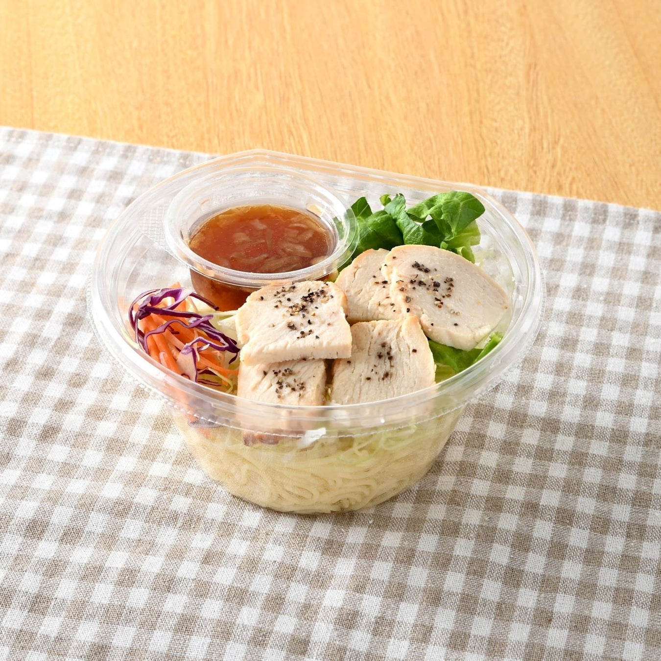 【内容】ブラックペッパーをトッピングしたローストチキンのパスタサラダです。和風オニオンドレッシングには、かつおと昆布の風味が効いた八方だしを使用しドレッシングの油量を削減しました。たんぱく質16.7g。