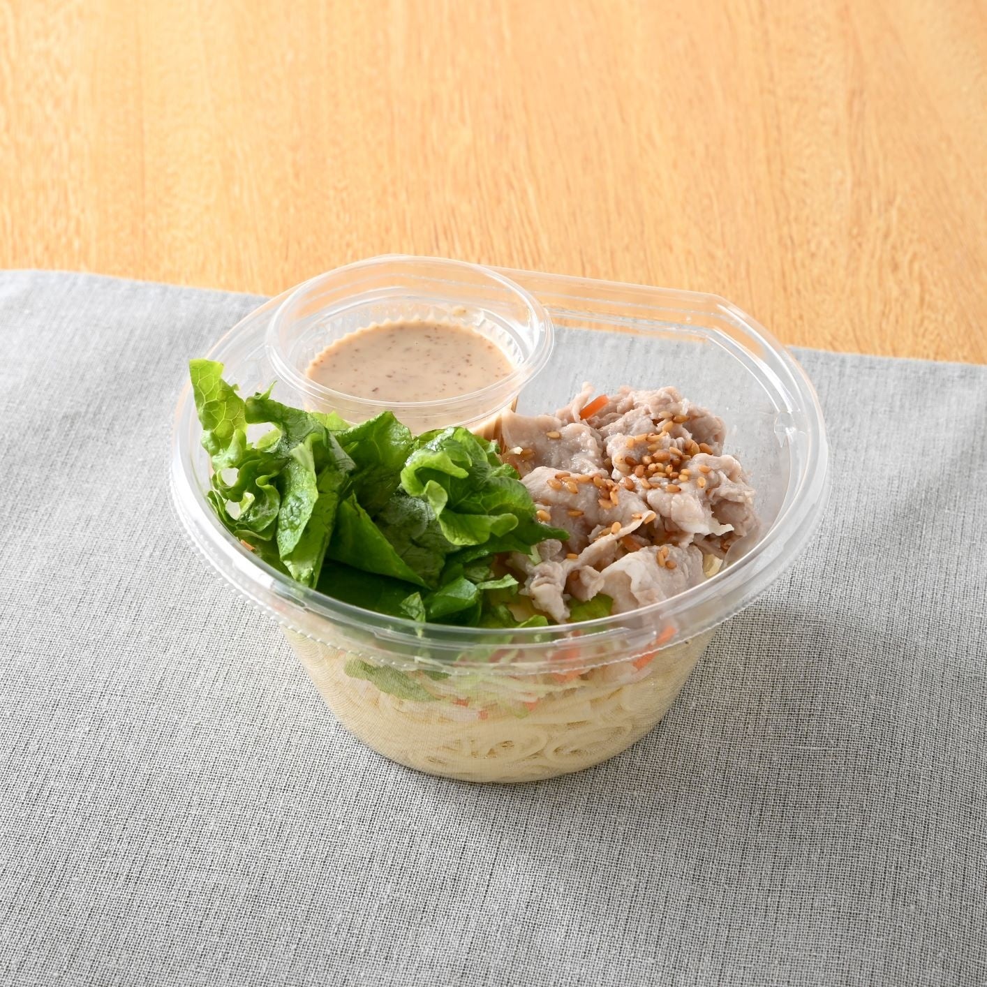 【内容】パスタサラダの定番商品、豚しゃぶとごまドレッシングの組み合わせです。ごまドレッシングはごまの香りにこだわり、油量を削減しました。たんぱく質12.2g。