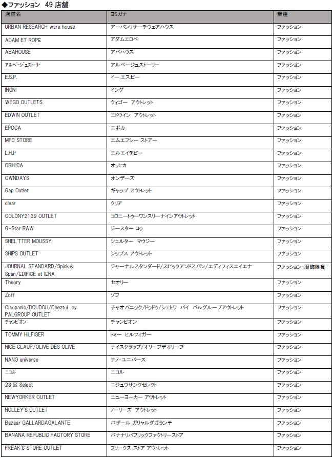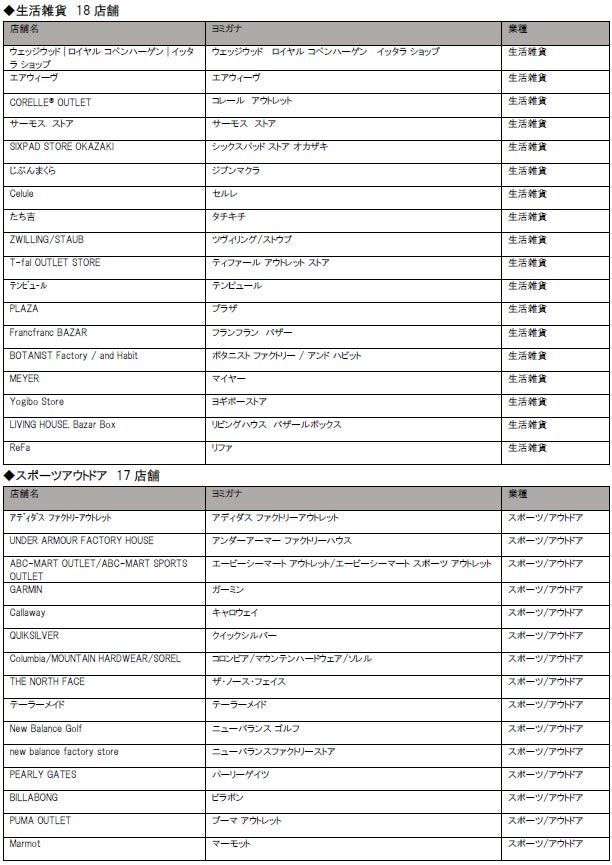 <添付資料①>「三井アウトレットパーク 岡崎」 出店店舗一覧(今般発表分の161店舗)