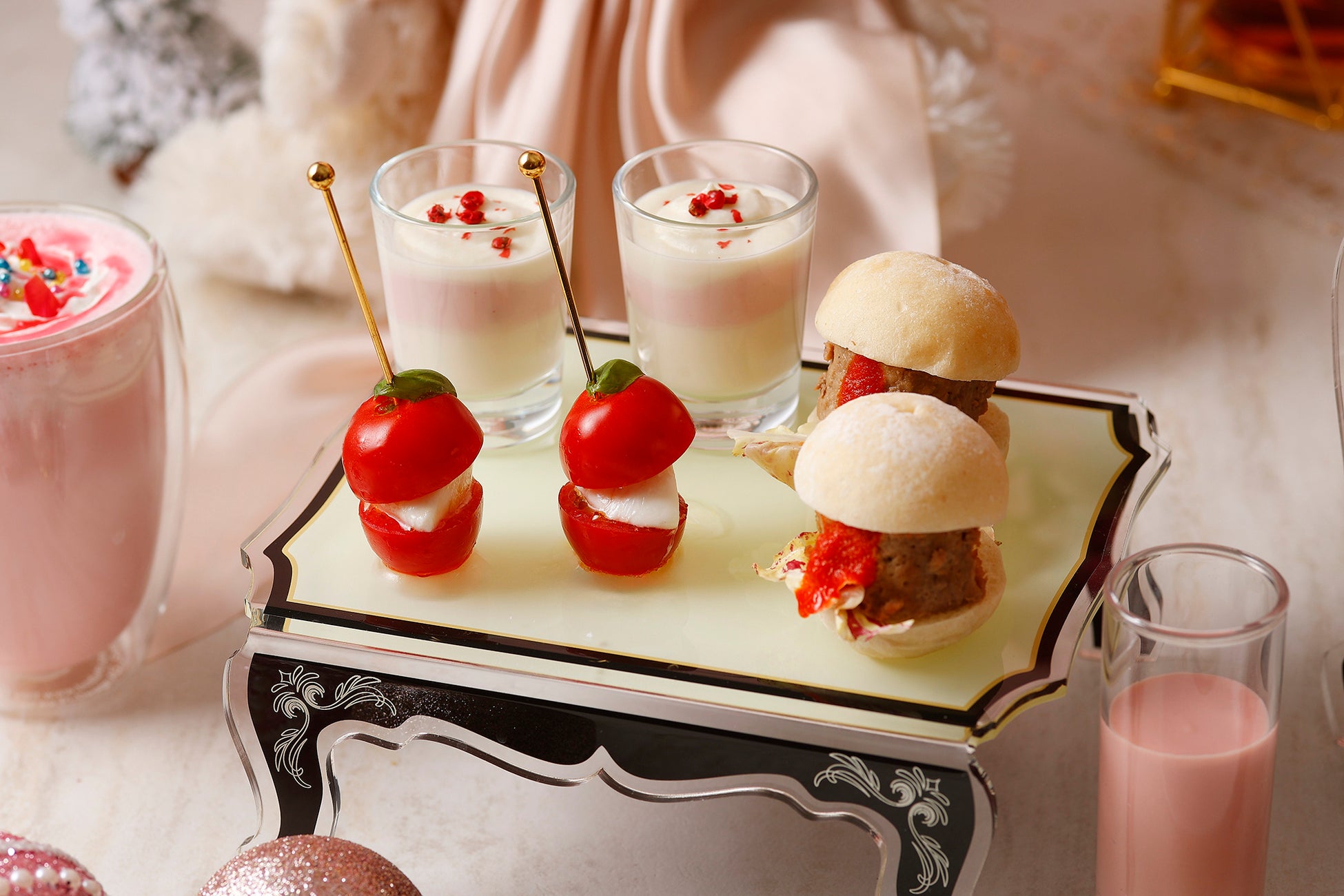 スイーツは、ピンクとホワイトのマカロンツリーや小さなフォルムのブッシュドノエル、トナカイをイメージしたホワイトチョコレートムースやサンタ帽子のコーンなど可愛らしさあふれるクリスマスオーナメントたちと、雪の結晶をまとったサンタカラーのグラスデザート、いちごのタルトやムースなど7種類がスタンドを彩ります。セイボリーはホワイトバンズのバーガーとサンタのようなミニカプレーゼ、ピンクとホワイトの色合いが可愛いホワイトチョコレートとカリフラワーのムースの3種類がラアインアップ。