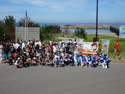 あきた海ごみゼロプロジェクト実行委員会は、7月3日(ナミの語呂合わせから『波の日-Surfers’Day』)に道の駅岩城の海浜で、秋田県内のサーファー有志およそ100人と一緒にボランティア活動を行いました。「釣りキチ三平ごみ拾い隊」も参加し、出前式「釣りキチ三平拾い箱」も駆けつけ、拾い箱とは何かを啓発しつつ、お子様にも楽しんでごみ拾いをして頂き、拾ったごみは分別され拾い箱前に多くの海洋ごみが集められました。